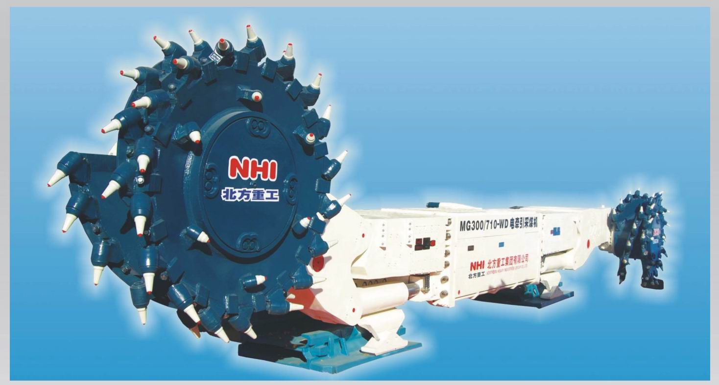 NHI developed MG450 (400)/1100(930) –WD and MG300(250)/710(610)-WD series AC electric haulage shearer on the basis of other advantaged technology of shearer. MG450 (400)/1100(930)-WD electric haulage shearer is a multi-motor drive type electric haulage shearer with motor horizontal layout and variable frequency electric shearer. It could be applied to the working surface angle≤35° of fully mechanized coal face and cutting hard coal, parting with different slot width 830-1000mm supporting the use of transport aircraft. It adopts entirety bent swinging arm structure which of good rigidity and more space of coal passing.